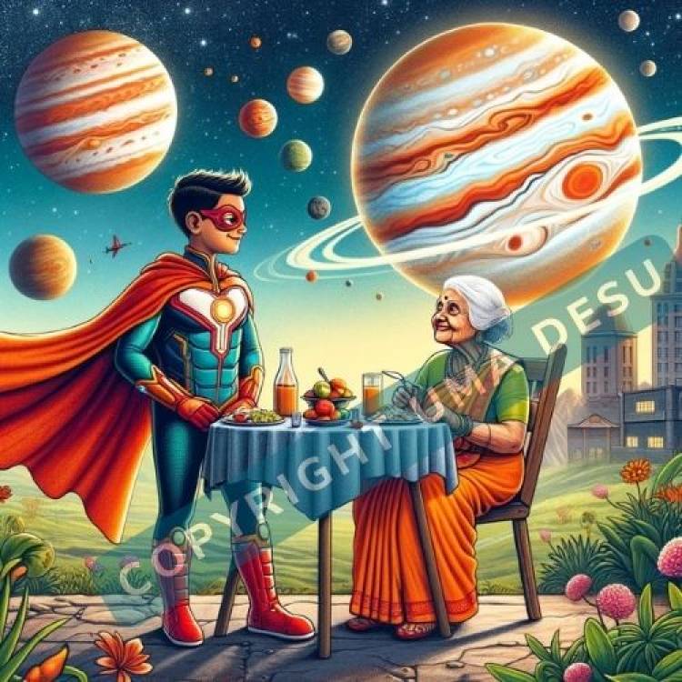 One chilly morning, as he jogged near the icy rings of Uranus, a craving hit Sky Jumper. "Brrr! It's freezing today! I could really go for some hot dosas and tea," he thought to himself. Remembering his Aunt Solaria's special dosas back on Jupiter, he zoomed off to her house, his cape fluttering behind him like a comet's tail.