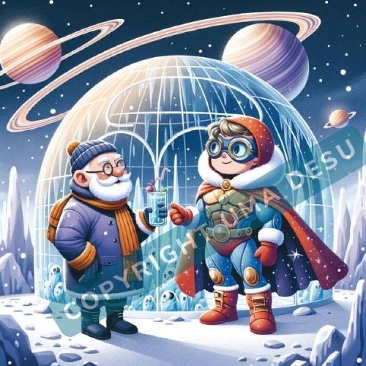 Grandpa Nebulo's house was a cozy igloo made of interstellar ice. He welcomed Sky Jumper with a warm hug and a cool drink made from melted mini-comet ice. "Ah, Sky Jumper, it's so good to see you! How's the universe treating you?"